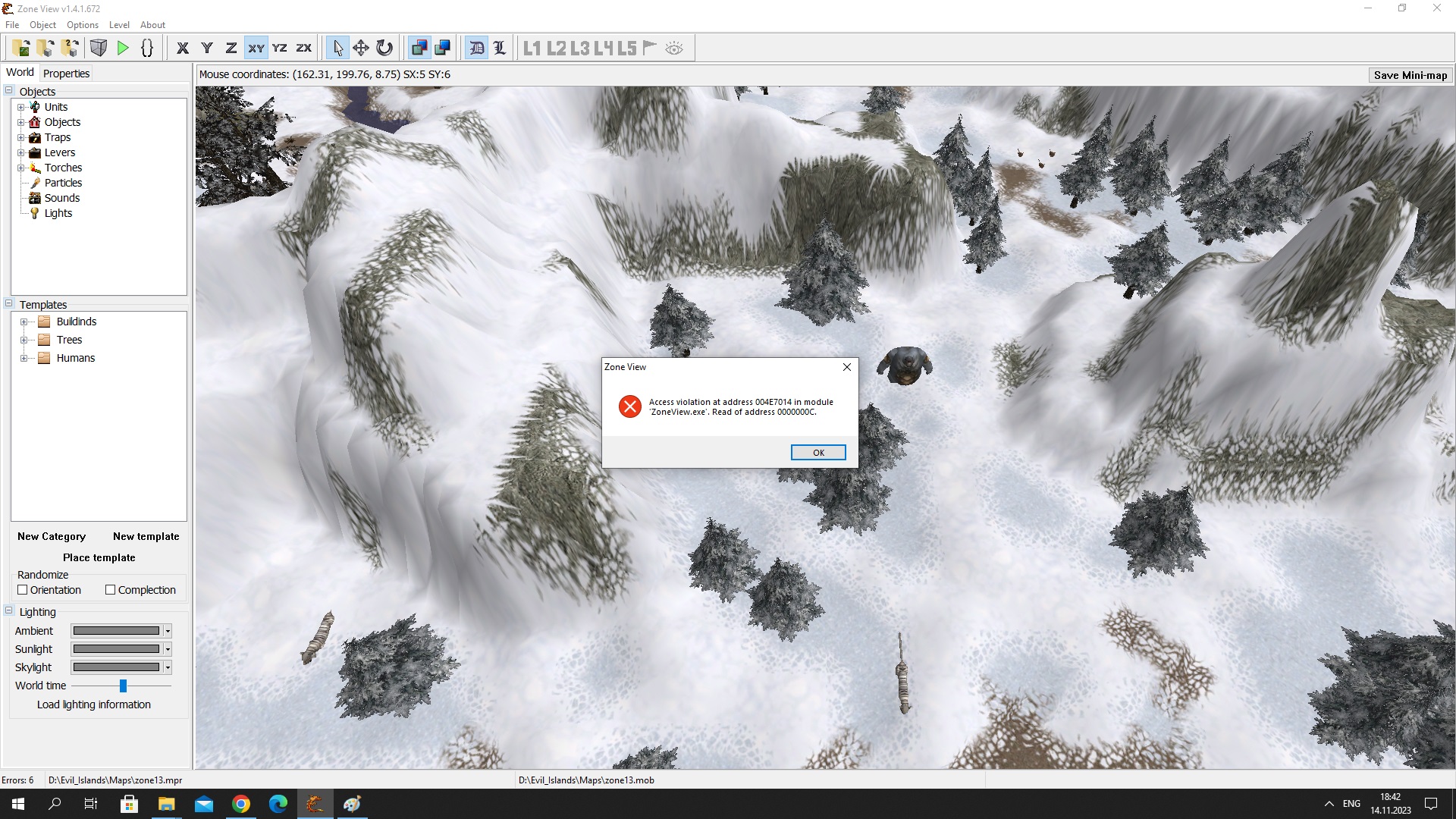 После этого новый .mob файл весит около 50 kb против оригинального почти 2000 kb. Ну и этот новый .mob файл не открывается больше в ZoneViewer, виснет. А в игре при заходе на карту происходит вылет. При этом после закрытия программы тоже ошибка.